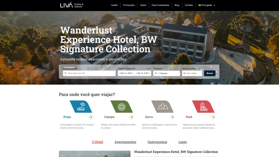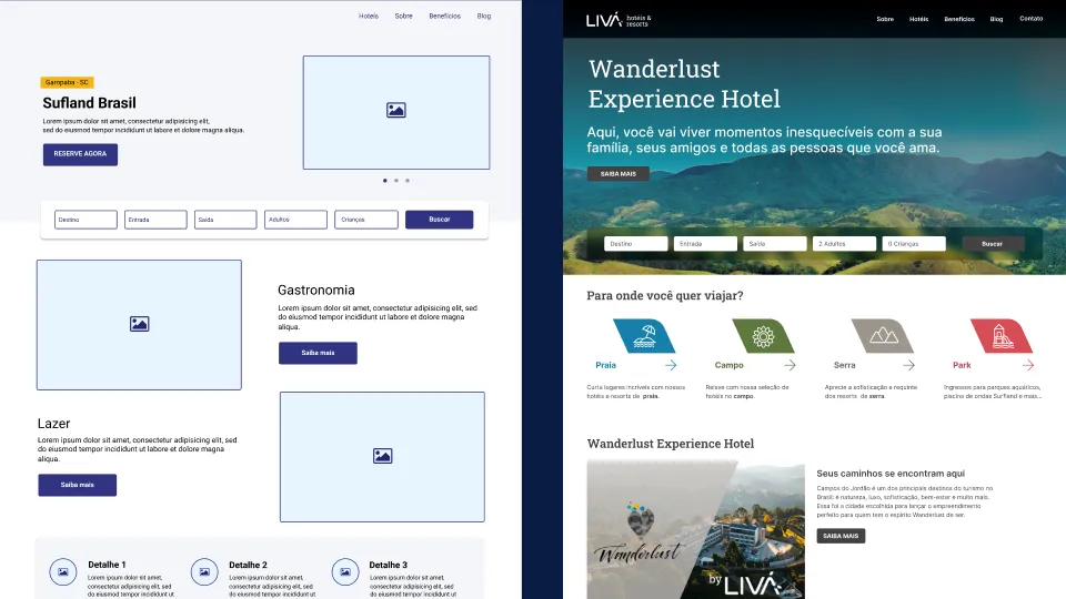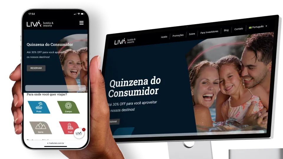 The Livá Hotels & Resorts site is now dynamic and responsive, delivering an engaging experience with a sophisticated visual interface. Its structure was designed to ensure smooth navigation, making it easy to access accommodations, services, and exclusive experiences.